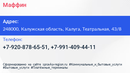 Маффин по адресу 248000, Калужская область, Калуга, Театральная, 43/8 в дальнейшем Организация, размещена в следующих категориях: