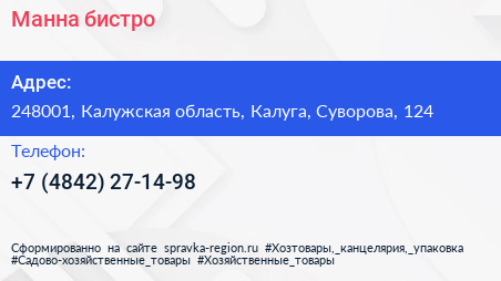 Манна, бистро по адресу 248001, Калужская область, Калуга, Суворова, 124 в дальнейшем Организация, размещена в следующих категориях: