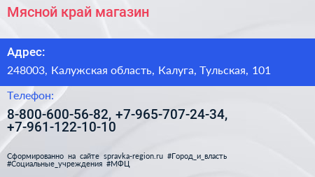 Мясной край, магазин по адресу 248003, Калужская область, Калуга, Тульская, 101 в дальнейшем Организация, размещена в следующих категориях: