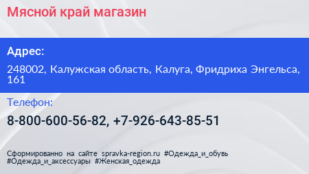Мясной край, магазин по адресу 248002, Калужская область, Калуга, Фридриха Энгельса, 161 в дальнейшем Организация, размещена в следующих категориях: