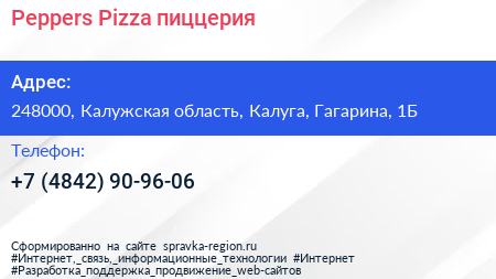 Peppers Pizza, пиццерия по адресу 248000, Калужская область, Калуга, Гагарина, 1Б в дальнейшем Организация, размещена в следующих категориях: