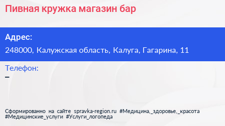 Пивная кружка, магазин-бар по адресу 248000, Калужская область, Калуга, Гагарина, 11 в дальнейшем Организация, размещена в следующих категориях: