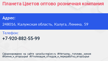 Планета Цветов, оптово-розничная компания по адресу 248016, Калужская область, Калуга, Ленина, 59 в дальнейшем Организация, размещена в следующих категориях: