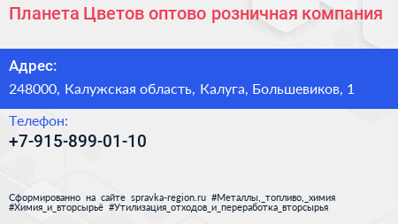 Планета Цветов, оптово-розничная компания по адресу 248000, Калужская область, Калуга, Большевиков, 1 в дальнейшем Организация, размещена в следующих категориях: