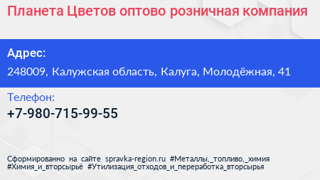 Планета Цветов, оптово-розничная компания по адресу 248009, Калужская область, Калуга, Молодёжная, 41 в дальнейшем Организация, размещена в следующих категориях: