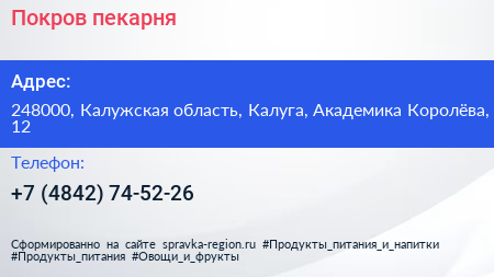 Покров, пекарня по адресу 248000, Калужская область, Калуга, Академика Королёва, 12 в дальнейшем Организация, размещена в следующих категориях: