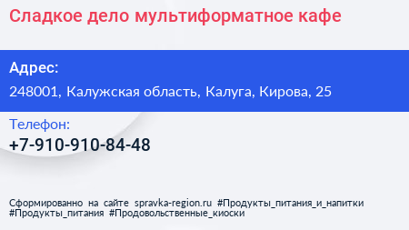 Сладкое дело, мультиформатное кафе по адресу 248001, Калужская область, Калуга, Кирова, 25 в дальнейшем Организация, размещена в следующих категориях: