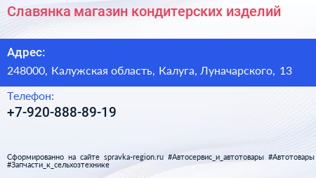 Славянка, магазин кондитерских изделий по адресу 248000, Калужская область, Калуга, Луначарского, 13 в дальнейшем Организация, размещена в следующих категориях: