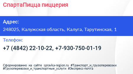 СпартаПицца, пиццерия по адресу 248025, Калужская область, Калуга, Тарутинская, 1 в дальнейшем Организация, размещена в следующих категориях: