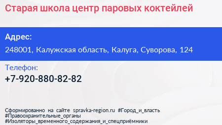 Старая школа, центр паровых коктейлей по адресу 248001, Калужская область, Калуга, Суворова, 124 в дальнейшем Организация, размещена в следующих категориях: