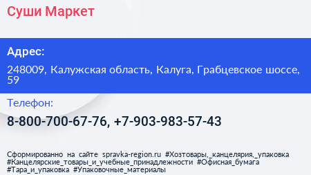 Суши-Маркет по адресу 248009, Калужская область, Калуга, Грабцевское шоссе, 59 в дальнейшем Организация, размещена в следующих категориях:
