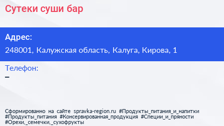 Сутеки, суши-бар по адресу 248001, Калужская область, Калуга, Кирова, 1 в дальнейшем Организация, размещена в следующих категориях: