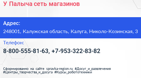 У Палыча, сеть магазинов по адресу 248001, Калужская область, Калуга, Николо-Козинская, 3 в дальнейшем Организация, размещена в следующих категориях: