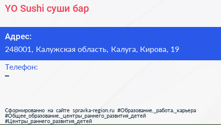 YO Sushi, суши-бар по адресу 248001, Калужская область, Калуга, Кирова, 19 в дальнейшем Организация, размещена в следующих категориях: