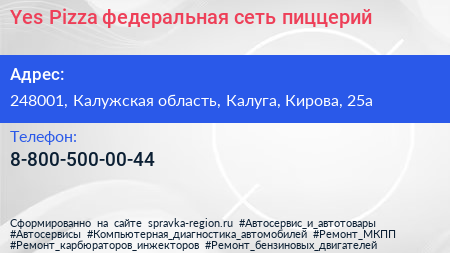 Yes Pizza, федеральная сеть пиццерий по адресу 248001, Калужская область, Калуга, Кирова, 25а в дальнейшем Организация, размещена в следующих категориях: