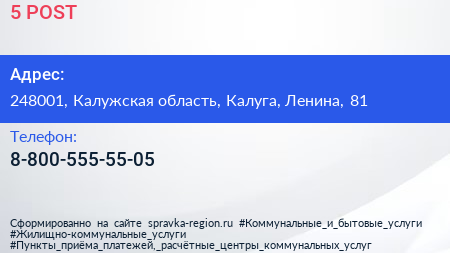 5 POST по адресу 248001, Калужская область, Калуга, Ленина, 81 в дальнейшем Организация, размещена в следующих категориях: