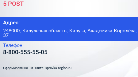 5 POST по адресу 248000, Калужская область, Калуга, Академика Королёва, 37 в дальнейшем Организация, размещена в следующих категориях: