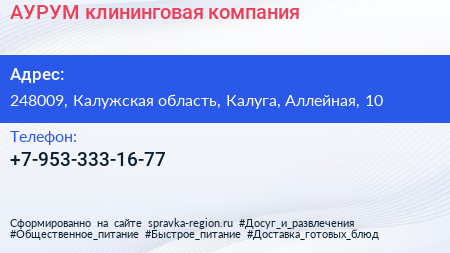 АУРУМ, клининговая компания по адресу 248009, Калужская область, Калуга, Аллейная, 10 в дальнейшем Организация, размещена в следующих категориях: