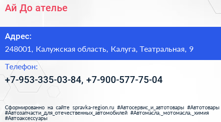Ай-До, ателье по адресу 248001, Калужская область, Калуга, Театральная, 9 в дальнейшем Организация, размещена в следующих категориях: