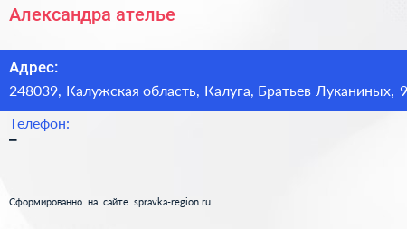 Александра, ателье по адресу 248039, Калужская область, Калуга, Братьев Луканиных, 9 в дальнейшем Организация, размещена в следующих категориях: