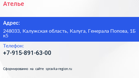 Ателье по адресу 248033, Калужская область, Калуга, Генерала Попова, 1Б к5 в дальнейшем Организация, размещена в следующих категориях: