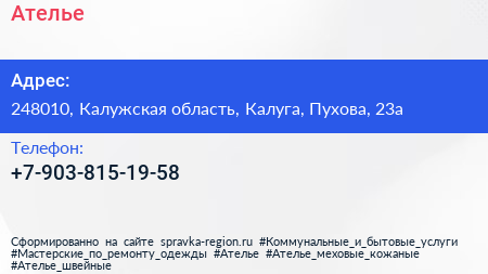 Ателье по адресу 248010, Калужская область, Калуга, Пухова, 23а в дальнейшем Организация, размещена в следующих категориях: