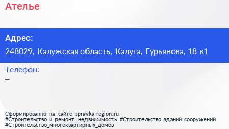 Ателье по адресу 248029, Калужская область, Калуга, Гурьянова, 18 к1 в дальнейшем Организация, размещена в следующих категориях: