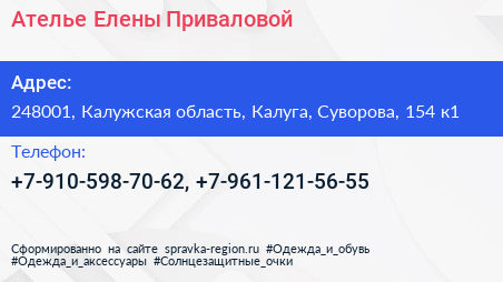 Ателье Елены Приваловой по адресу 248001, Калужская область, Калуга, Суворова, 154 к1 в дальнейшем Организация, размещена в следующих категориях: