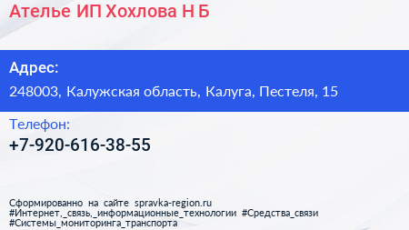 Ателье, ИП Хохлова Н.Б. по адресу 248003, Калужская область, Калуга, Пестеля, 15 в дальнейшем Организация, размещена в следующих категориях: