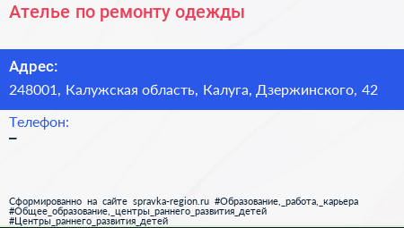 Ателье по ремонту одежды по адресу 248001, Калужская область, Калуга, Дзержинского, 42 в дальнейшем Организация, размещена в следующих категориях: