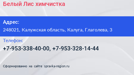 Белый Лис, химчистка по адресу 248021, Калужская область, Калуга, Глаголева, 3 в дальнейшем Организация, размещена в следующих категориях: