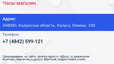 Часы, магазин по адресу 248000, Калужская область, Калуга, Ленина, 100 в дальнейшем Организация, размещена в следующих категориях: