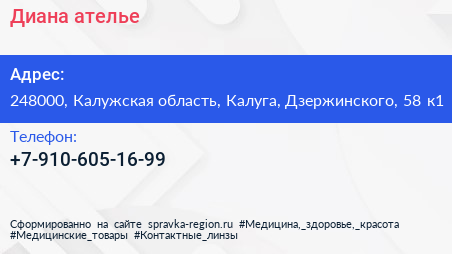 Диана, ателье по адресу 248000, Калужская область, Калуга, Дзержинского, 58 к1 в дальнейшем Организация, размещена в следующих категориях: