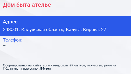 Дом быта, ателье по адресу 248001, Калужская область, Калуга, Кирова, 27 в дальнейшем Организация, размещена в следующих категориях: