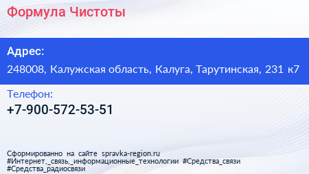 Формула Чистоты по адресу 248008, Калужская область, Калуга, Тарутинская, 231 к7 в дальнейшем Организация, размещена в следующих категориях: