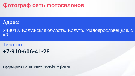 Фотограф, сеть фотосалонов по адресу 248012, Калужская область, Калуга, Малоярославецкая, 6 к3 в дальнейшем Организация, размещена в следующих категориях: