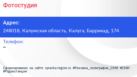 Фотостудия по адресу 248018, Калужская область, Калуга, Баррикад, 174 в дальнейшем Организация, размещена в следующих категориях: