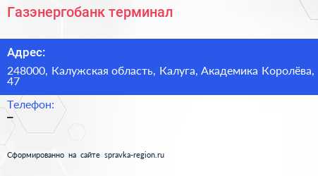 Газэнергобанк, терминал по адресу 248000, Калужская область, Калуга, Академика Королёва, 47 в дальнейшем Организация, размещена в следующих категориях: