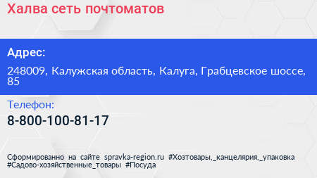 Халва, сеть почтоматов по адресу 248009, Калужская область, Калуга, Грабцевское шоссе, 85 в дальнейшем Организация, размещена в следующих категориях: