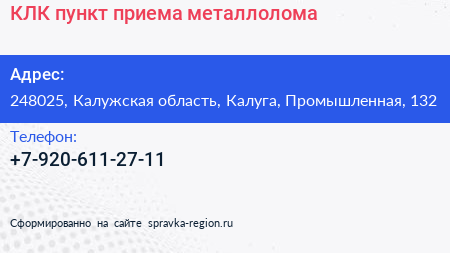 КЛК, пункт приема металлолома по адресу 248025, Калужская область, Калуга, Промышленная, 132 в дальнейшем Организация, размещена в следующих категориях: