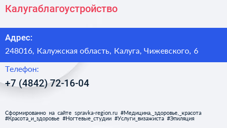 Калугаблагоустройство по адресу 248016, Калужская область, Калуга, Чижевского, 6 в дальнейшем Организация, размещена в следующих категориях: