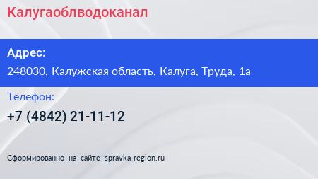 Калугаоблводоканал по адресу 248030, Калужская область, Калуга, Труда, 1а в дальнейшем Организация, размещена в следующих категориях: