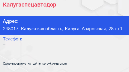 Калугаспецавтодор по адресу 248017, Калужская область, Калуга, Азаровская, 28 ст1 в дальнейшем Организация, размещена в следующих категориях: