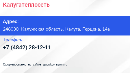 Калугатеплосеть по адресу 248030, Калужская область, Калуга, Герцена, 14а в дальнейшем Организация, размещена в следующих категориях: