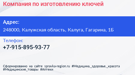 Компания по изготовлению ключей по адресу 248000, Калужская область, Калуга, Гагарина, 1Б в дальнейшем Организация, размещена в следующих категориях: