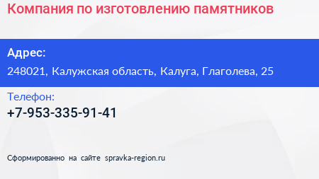Компания по изготовлению памятников по адресу 248021, Калужская область, Калуга, Глаголева, 25 в дальнейшем Организация, размещена в следующих категориях: