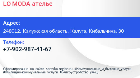 LO-MODA, ателье по адресу 248012, Калужская область, Калуга, Кибальчича, 30 в дальнейшем Организация, размещена в следующих категориях: