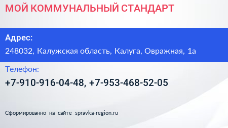 МОЙ КОММУНАЛЬНЫЙ СТАНДАРТ по адресу 248032, Калужская область, Калуга, Овражная, 1а в дальнейшем Организация, размещена в следующих категориях: