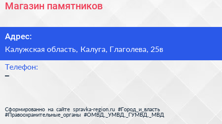 Магазин памятников по адресу Калужская область, Калуга, Глаголева, 25в в дальнейшем Организация, размещена в следующих категориях: