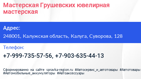 Мастерская Грушевских, ювелирная мастерская по адресу 248001, Калужская область, Калуга, Суворова, 128 в дальнейшем Организация, размещена в следующих категориях: